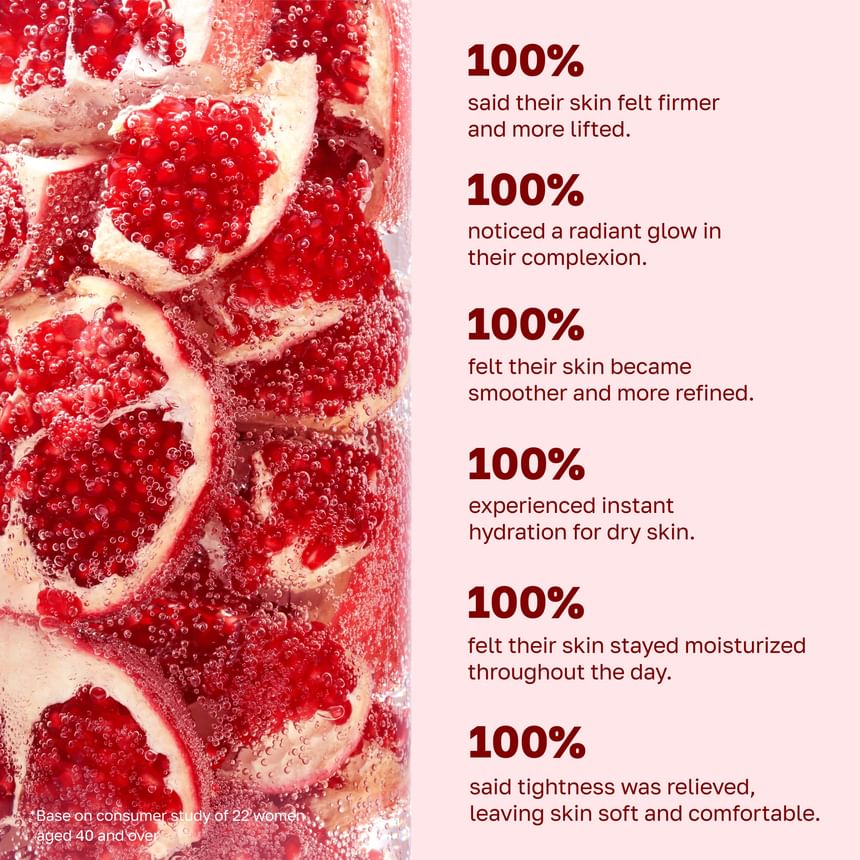 Infused with 60% Pomegranate Water and Vegan Collagen Extract to help improve firmness and radiance with antioxidant-rich red energy and non-animal, gentle formula.