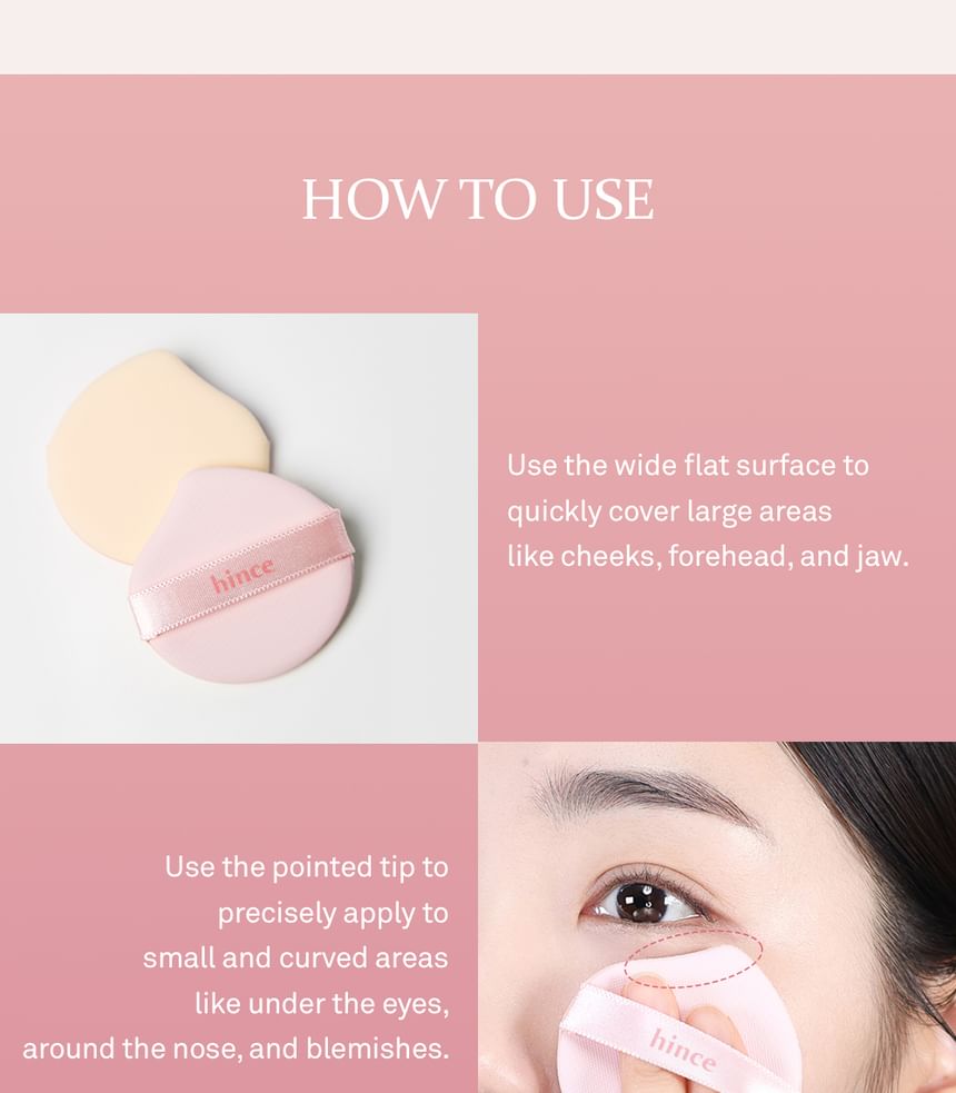 Using the included puff, apply on wider facial areas (ex. cheek, forehead) and blend for your desired coverage.