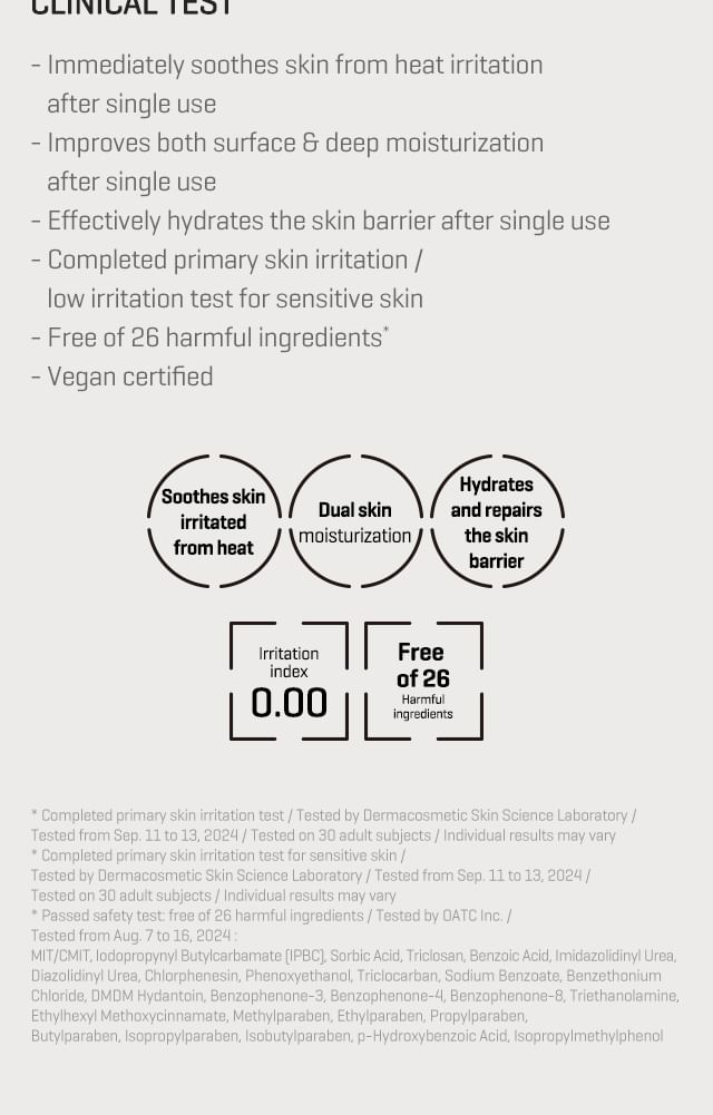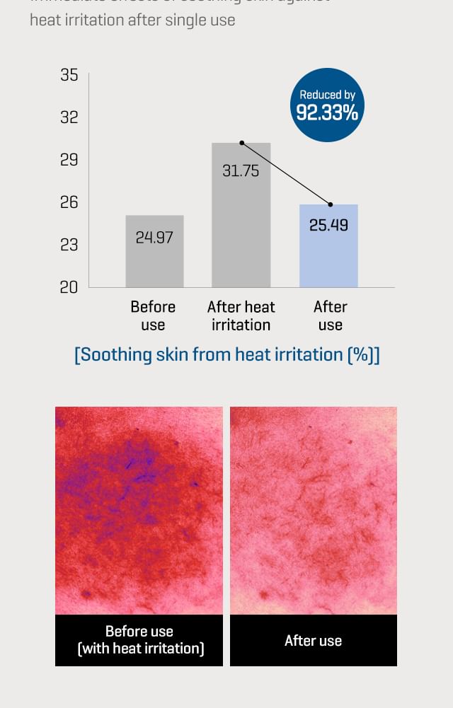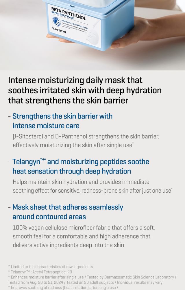 Beta-sitosterol and D-panthenol make firm skin barrier to improve skin moisture barrier after single use. The Telangyn™ and moisturizing peptide supply moisture to soothe heat that help maintain skin moisture and soothe skin. Provides instant soothing and improvement of red and sensitive skin due to irritation after single use. The fine plant-based fabric made with 100% cellulose provides soft and smooth feeling of use with excellent adhesion. This comfortable vegan mask delivers active ingredients deep inside skin.